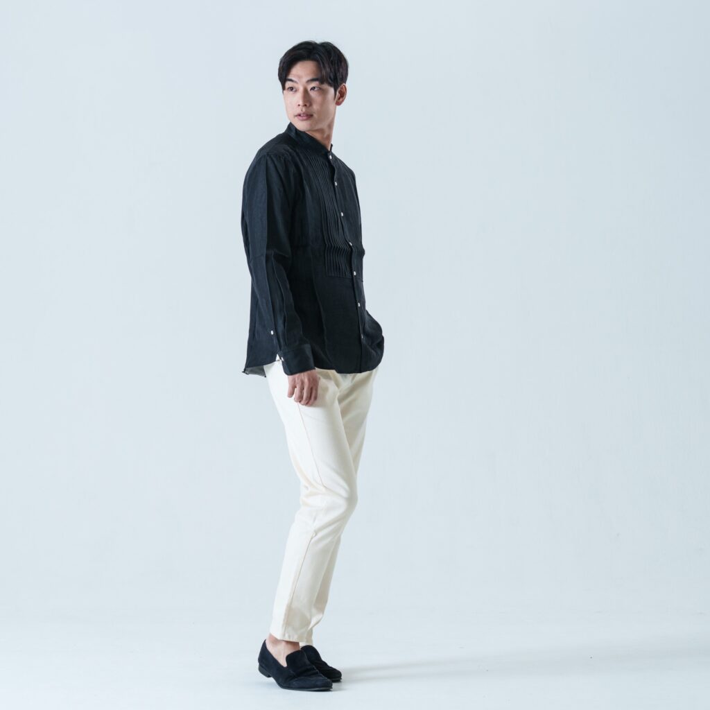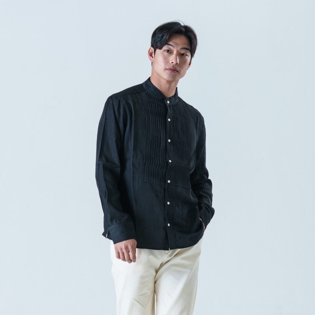 デニムというカジュアルな素材に綺麗めデザインの洗練されたピンタックを施し、カジュアルとラグジュアリーを兼ね備えた「デニムドレスシャツ」