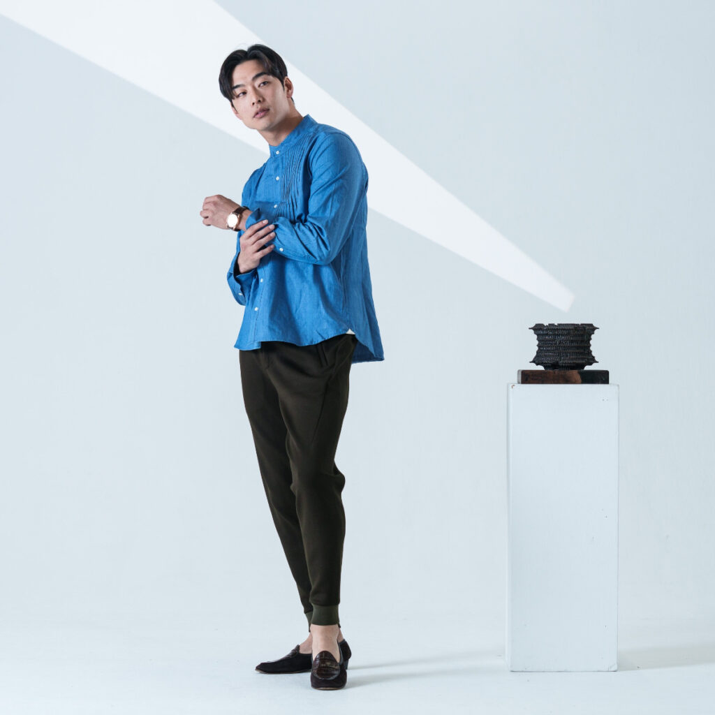 ピンタックシャツって決まりすぎててちょっと自分が着るイメージが持てないという印象も、デニム素材を使用し身近に感じていただけるデザインに。