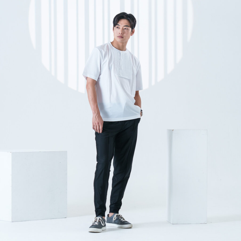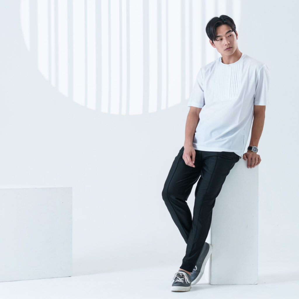 シワになりにくくお手入れも簡単でゴルフや移動も快適、今回はセットアップと同素材のTシャツのを合わせた3ピースもおすすめ。