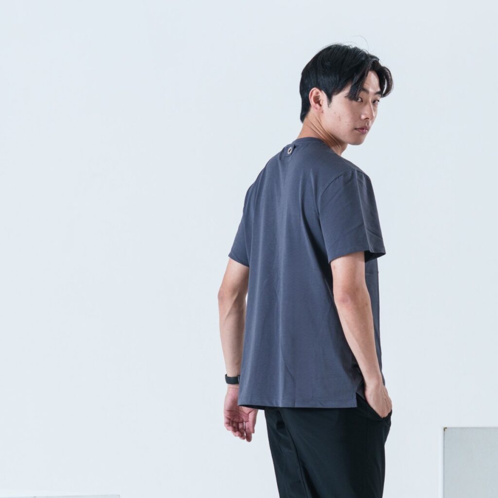背面にあしらったメタルリングがTシャツ1枚のスタイルも