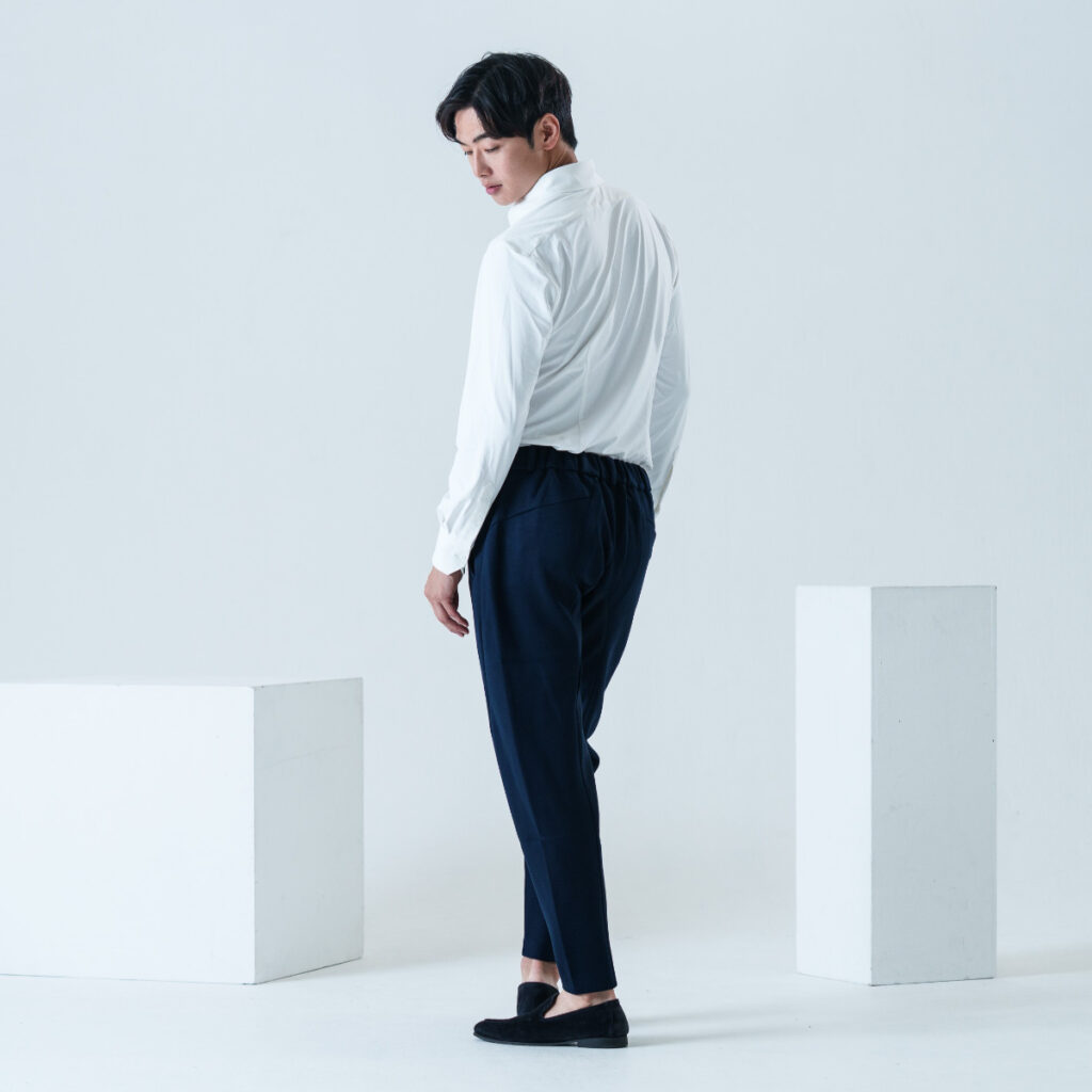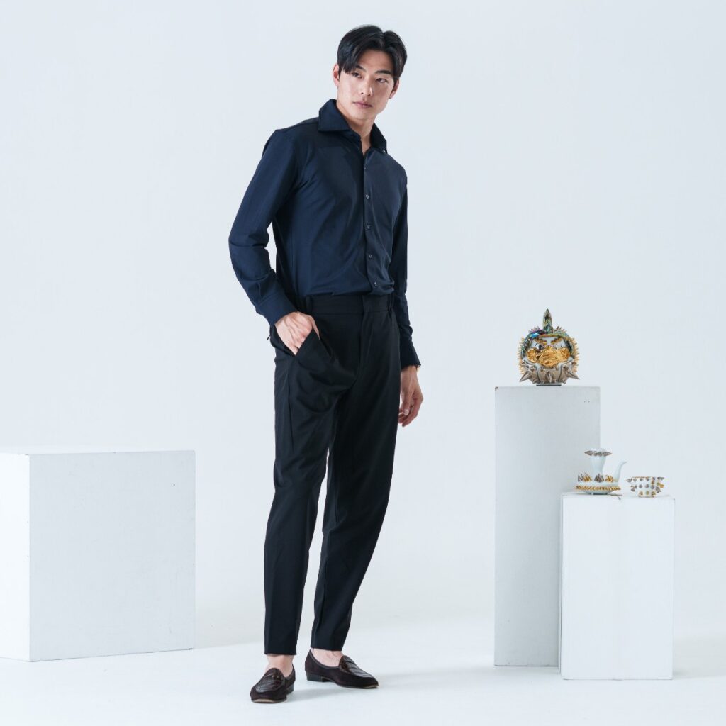 ネクタイを締めてのビジネススタイルは勿論のこと、ボタンを開けた時の衿の開きにとことんこだわりボタンの位置を設定。計算された衿の開きが生み出す色っぽく上品な見た目快適な着心地を体験できます。