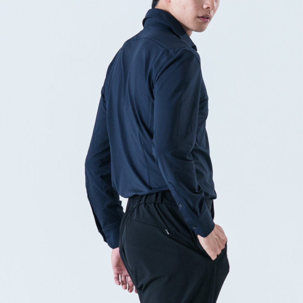 通常のビジネスシャツとは比較にならないストレッチ性を得るために採用したのはスイムウェアで使われる特殊素材、ほとんどシワにならないので出張での持ち運びもラクラク。